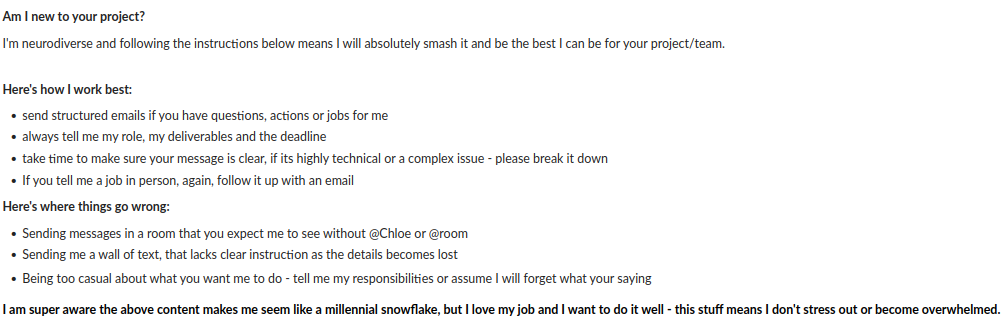 Does your workplace have an employee directory or before projects do you have kick-off meetings? These are great ways to show people how to best communicate with you to ensure you can perform at your highest level. This way, when you get pulled up on something, that was presented to you in a non-ADHD friendly manner – you can stand strong knowing you did your best to raise awareness, they ignored it and this is on them. For example at my work, we have a directory with a profile for each person – here’s mine: